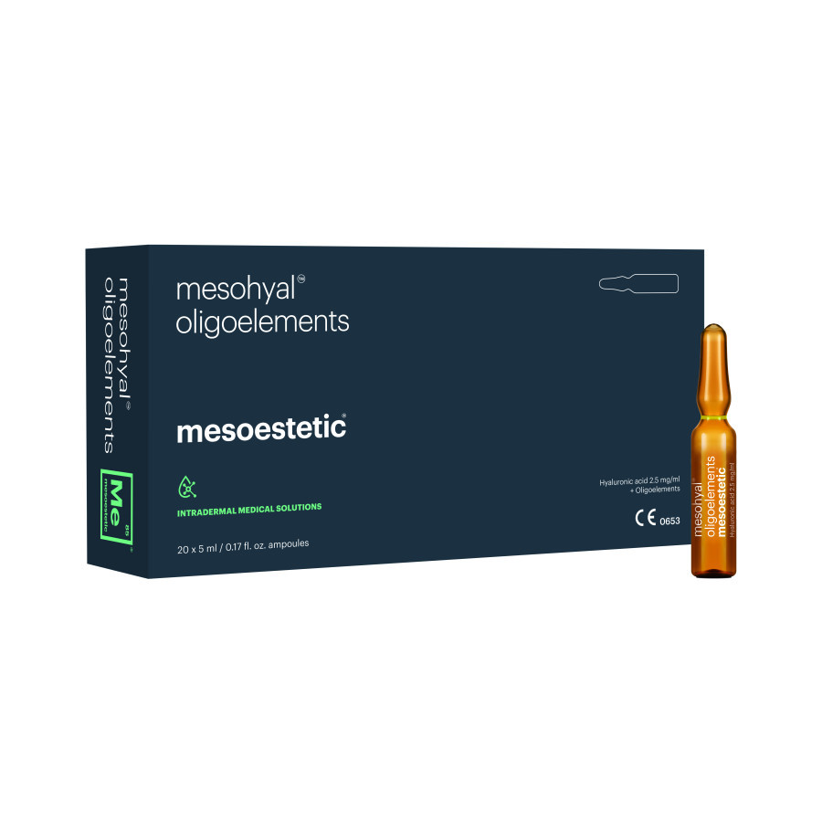 Коктейль mesohyal OLIGOELEMENTS состоит из гиалуроновой кислоты, связанной с 9 микроэлементами, обеспечивающей активацию биологических процессов в коже, ускорение обменных процессов в клетках, улучшая тем самым структуру кожи и устраняя признаки старения.