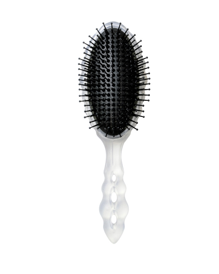 Щетина оригинального дизайна. Поскольку окончание щетины закруглено, щетина деликатна к коже головы, что позволяет крепко захватить волосы. Основание щетины шестиугольное, а не круглое, что позволяет просушивать волос под разными углами. Также шестиугольная у основания щетина более устойчива даже сильному натяжению.