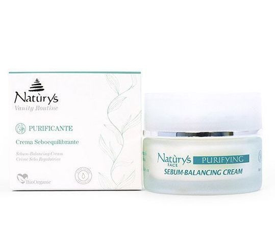 Органічний крем для обличчя, що нормалізує роботу сальних залоз, Bema Cosmetici Natùrys Vanity Routine Sebum-Balancing Cream спеціально розроблений для догляду за жирною та комбінованою шкірою. Завдяки комплексу активних компонентів (екстракти бурих водоростей, гамамелісу та верби, олії ілліпе, таману та солодкого мигдалю) контролює секрецію сальних залоз, усуває закупорку пір, знижує жирність шкіри та надає їй матовості. Натуральний крем для обличчя Bema Cosmetici Natusy Vanity Routine Sebum-Balancing Cream активізує процес метаболізму в клітинах шкіри, підвищує її тонус, робить гладкою та еластичною.