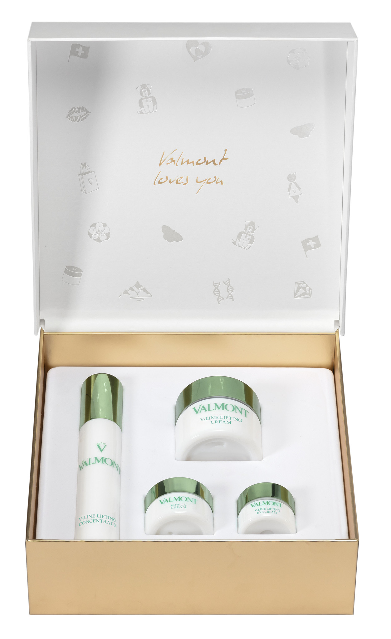 Склад набору: Valmont Крем для наповнення зморшок V-Shape Filling Cream, 50 мл. Valmont Концентрат для заповнення зморшок V-Shape Filling Concentrate, 30мл. Valmont Антивіковий крем для шиї V-Neck Cream, 15 мл. Valmont Крем для наповнення зморшок для шкіри навколо очей V-Shape Filling Eye Balm, 5 мл.