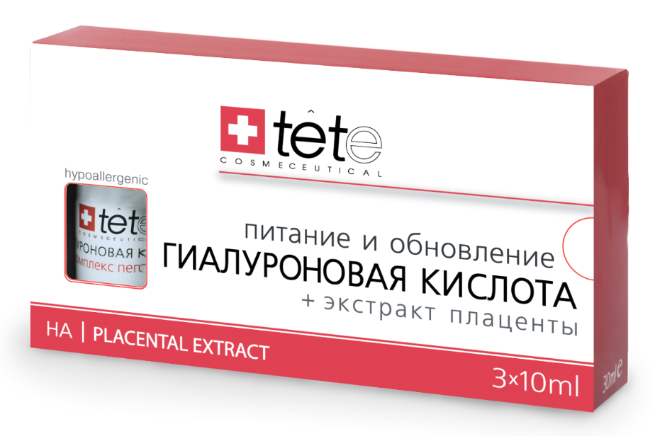 Гиалуроновая кислота с плацентой TETe в непрозрачных флаконах по 10 мл – высокоэффективный косметический биокомплекс с экстрактом плаценты и низкомолекулярной ГК для питания и обновления кожи. Средство улучшает кровообращение дермы, способствует ее усиленному питанию, выведению шлаков и токсином, уменьшению бледности и пастозности кожи. Оно также активирует клеточное дыхание, останавливает процессы старения клеток, оказывает ярко выраженное противовоспалительное и генерирующее действие. Если вы хотите остановить возрастной эффект старения кожи, купите гиалуроновую кислоту TETe в нашем магазине и повторите ее эффект на себе. Вы будете приятно удивлены ее деликатным действием и своими косметологическими превращениями. Для возраста 40-45+ Наносить на очищенную кожу утром и вечером под крем или как самостоятельное средство. Для достижения выраженного эффекта рекомендуется курс применения 10-14 недель. Состав: Water, sodium hyaluronate, placental extract.