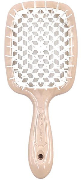 Щетка Janeke - цельная. Зубчики вылиты в форме вместе с основой и выполнены из мягкого и гибкого пластика. Основа немного выпуклая по форме и сделана по типу решетки, тонкая и гибкая. Сочетание такой конструкции и полумягкого пластика создает массажный эффект. Поэтому это не просто расческа, а именно массажная щетка. Щетка удобно лежит в руке. Корпус щетки сделан из легкого, но тем не менее прочного твердого пластика. Лаконичный и эргономичный дизайн.