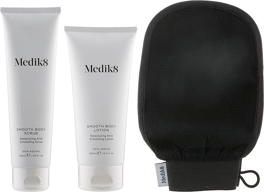 Набор воздействует на видимые признаки фолликулярного кератоза; омолаживает и глубоко увлажняет кожу. Скраб и лосьон содержат отшелушивающие кислоты, которые легко удаляют мертвые клетки кожи и очищают закупоренные поры. Это обеспечивает обновление и выравнивание поверхности кожи. Также продукты содержат питательные компоненты, благодаря которым кожа тела становится нежной, мягкой и шелковистой. Пора забыть о сухости, шероховатости и шелушении кожи тела! Набор Smooth Body Exfoliating Kit также идеально подходит как для подготовки кожи к искусственному или автозагару, так и сыграет роль SOS-средства в случае неудачного нанесения автозагара. Продукты помогут создать безупречно ровную и гладкую поверхность, на которую хорошо ложится загар; или же спасти от нежелательных пятен и полосок при неудачных последствиях автозагара.