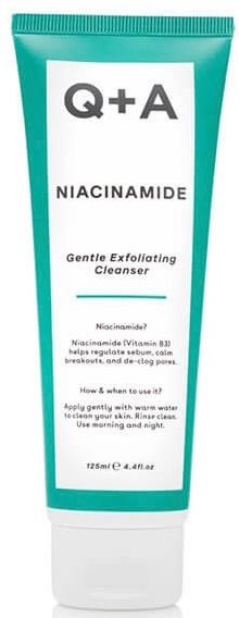 Q+A Niacinamide Gentle Exfoliating Cleanser – м'який гель для обличчя з відлущуючим ефектом. Дбайливо видаляє забруднення, вирівнює тон шкіри, пом'якшує, зволожує та відновлює здорову мікрофлору. Містить мікрогранули жожоба, виготовлені з натурального рослинного воску. Вони мають правильну сферичну форму, завдяки чому не дряпають і не ушкоджують шкіру, на відміну, наприклад, від розмелених кісточок чи шкаралупи горіха. А ще вони повністю біорозкладаються і не забруднюють довкілля як поліетиленові гранули, які теж часто використовують у відлущувальних засобах.
